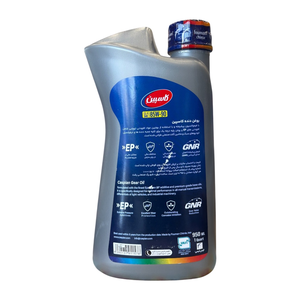 گیربکس از مهمترین و حساسترین قسمتهای خودروست که باید بهخوبی مراقبت شود. بهترین روش مراقبت از گیربکس، انتخاب روغن گیربکس مناسب است. محصولی که مشاهده میکنید، روغن گیربکس «کاسپین» بوده که با مدل «Gl4 85W90» به بازار عرضه شده است. کاسپین نامی شناختهشده در صنعت پتروشیمی است. این شرکت سالهاست که در زمینهی تولید انواع فرآوردههای نفتی فعالیت میکند. این محصول دارای سطح کیفیت GL4 بوده و از کیفیت مناسبی بهره میبرد. روغن گیربکس کاسپین مناسب برای استفاده در تمامی جعبهدندههای دستی و دیفرانسیل خودروهای سواری و سایر وسایل نقلیه سبک و سنگین است. از جمله ویژگیهای این محصول میتوان به محافظت در برابر خوردگی و بدون تاثیر منفی روی قطعات جعبهدنده اشاره کرد. شاخص بسیار مهم این روغن گیربکس توان و مقاومت آن در شرایط سخت کاری و تحمل عالی آن در برابر بار زیاد است. این محصول در شرایط آب و هوایی مختلف از عملکرد مناسبی برخوردار است.